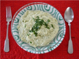Nun die Kartoffeln in der Rahmsoße heiß werden lassen und mit Salz und einem Spritzer Maggi abschmecken.